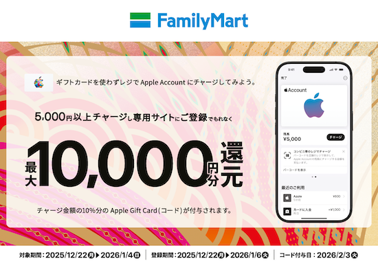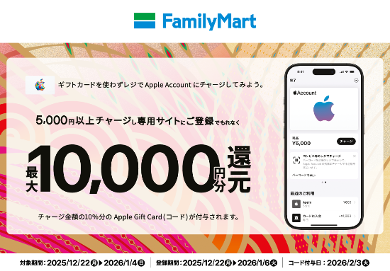 2025年12月22日(月)〜2026年1月4日(日)の期間中、ファミリーマートのレジでApple Accountに合計5,000円以上チャージし、キャンペーンページから登録すると、合計チャージ金額の10%分のApple Gift Card(コード)をもれなくプレゼントするキャンペーンが実施されます。