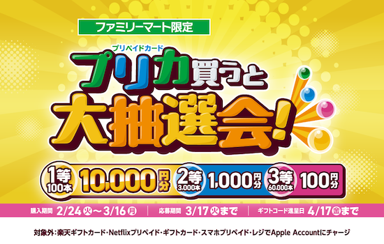 2026年2月24日(火)〜3月16日(月)の期間中、ファミリーマートで対象のプリペイドカード(POSAカード)を購入し、応募するとファミペイギフトコード最大1万円分が抽選で当たるキャンペーンが実施されます。