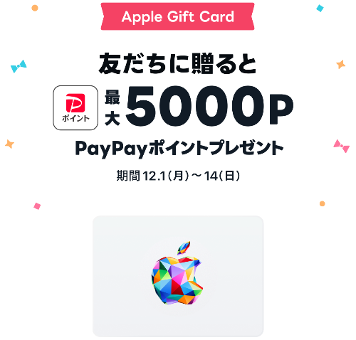 2025年12月1日(月)〜12月14日(日)の期間中、LINEマイカード内でApple Gift Cardを友だちに贈るとPayPayポイントが最大10%還元されるキャンペーン実施中です。
