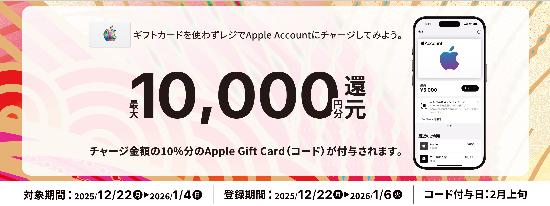 2025年12月22日(月)〜2026年1月4日(日)の期間中、セブン‐イレブンのレジでApple Accountに合計5,000円以上チャージし、キャンペーンページから登録すると、合計チャージ金額の10%分のApple Gift Card(コード)をもれなくプレゼントするキャンペーンが実施されます。