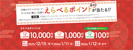 2025年12月15日(月)〜2026年1月11日(日)の期間中、セブン-イレブンで対象のプリペイドカード・サービスを購入すると抽選でえらべるポイントがプレゼントされます。